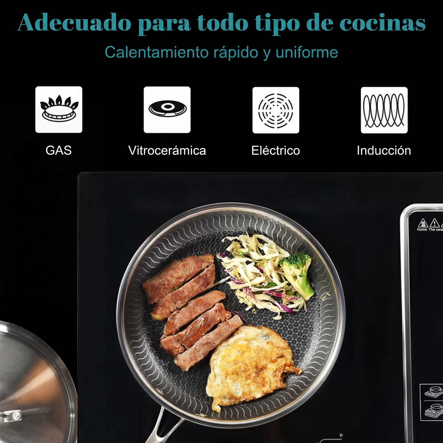 Mereces una experiencia culinaria sin límites. Presentamos la Sartén Híbrida con Tecnología de Panal, la verdadera revolución que llega para jubilar a las opciones tradicionales del mercado. Por fin, una sartén que combina la resistencia indestructible del acero inoxidable con la comodidad total del mejor antiadherente, 100% libre de toxinas.