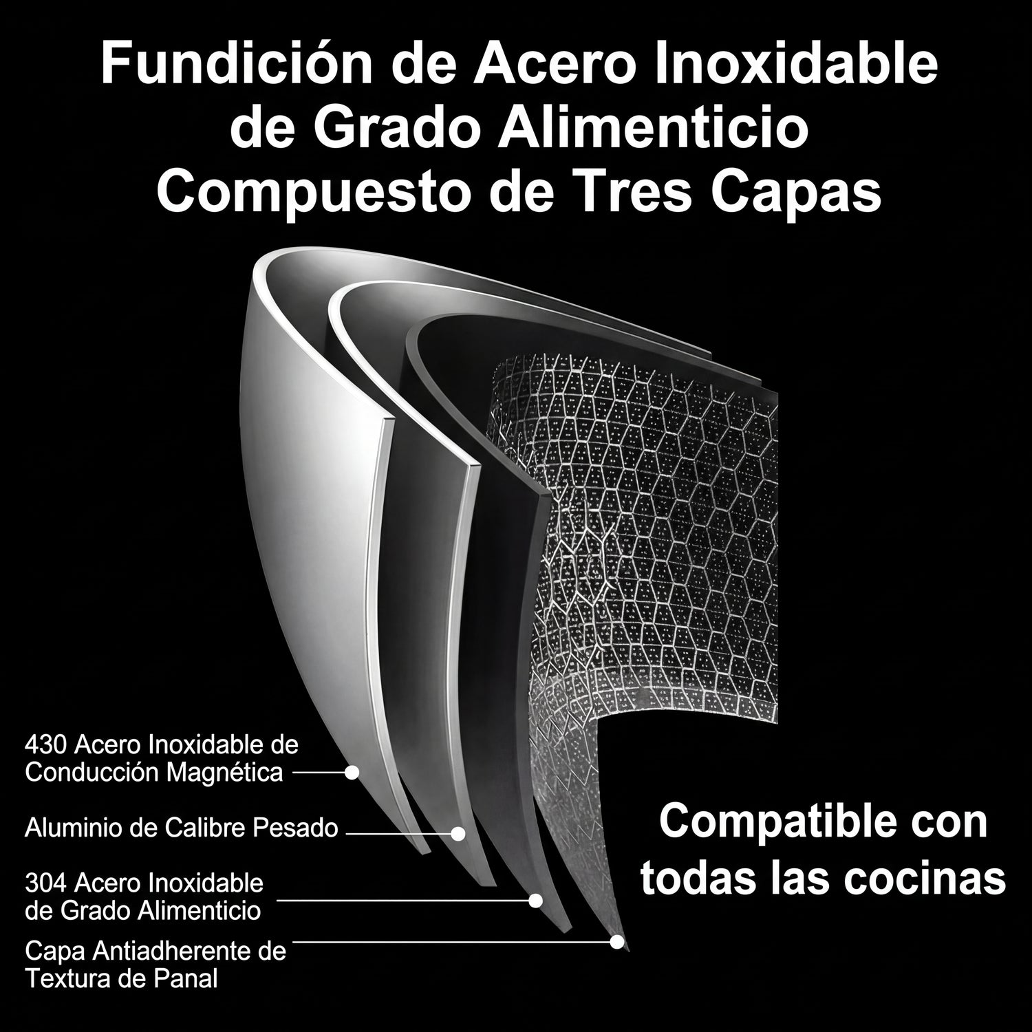Nuestra tecnología híbrida elimina este riesgo: el relieve de acero inoxidable de grado quirúrgico protege las celdas antiadherentes, evitando que se degraden o se filtren en tu comida. Es una superficie 100% libre de toxinas, diseñada para quienes ponen la salud en primer lugar.